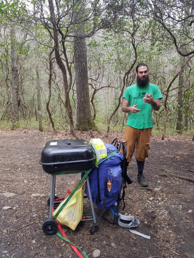 My feet started hurting so bad I stopped early at a shelter while the rest of my trail family pushed on to a further campsite. I’m sitting there, mercifully off my feet and feeling pretty crappy that I can’t keep up when loud clanking comes from the trail. Wok (the guy who fed us at Neel’ s gap because it was his birthday) shows up with a full sized grill strapped to his back. He brought hot dogs, burgers, and beer to the shelter.