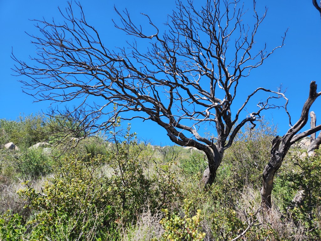 Crossing under the I-8, started a long ascent into the mountains Cleveland National Forest. The sun was blocked on the side I was walking for the first few hours by the mountain itself. Soon though I curved around into the direct sun and even at 1000 it was blazingly hot. For about two miles it was a climb up with no shade. I could feel the salt crystals forming as my sweat evaporated, almost like I was being salted as they do pork or fish. Eventually I made it to some small trees that offered little succor, but it was a break.