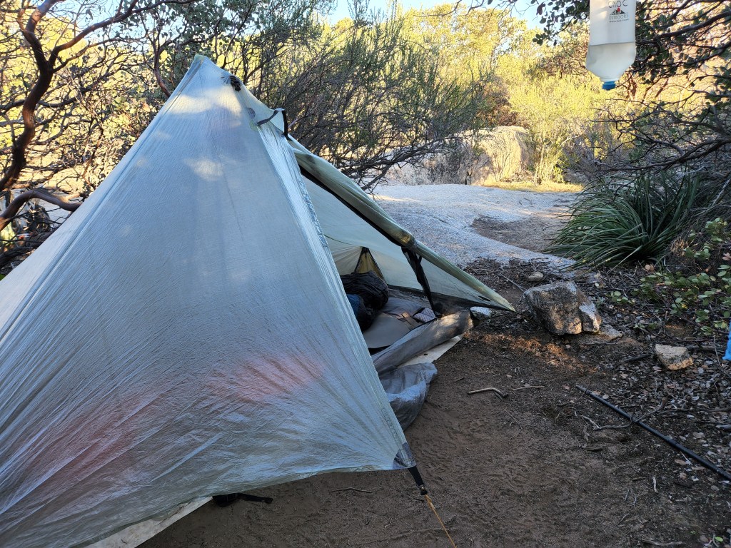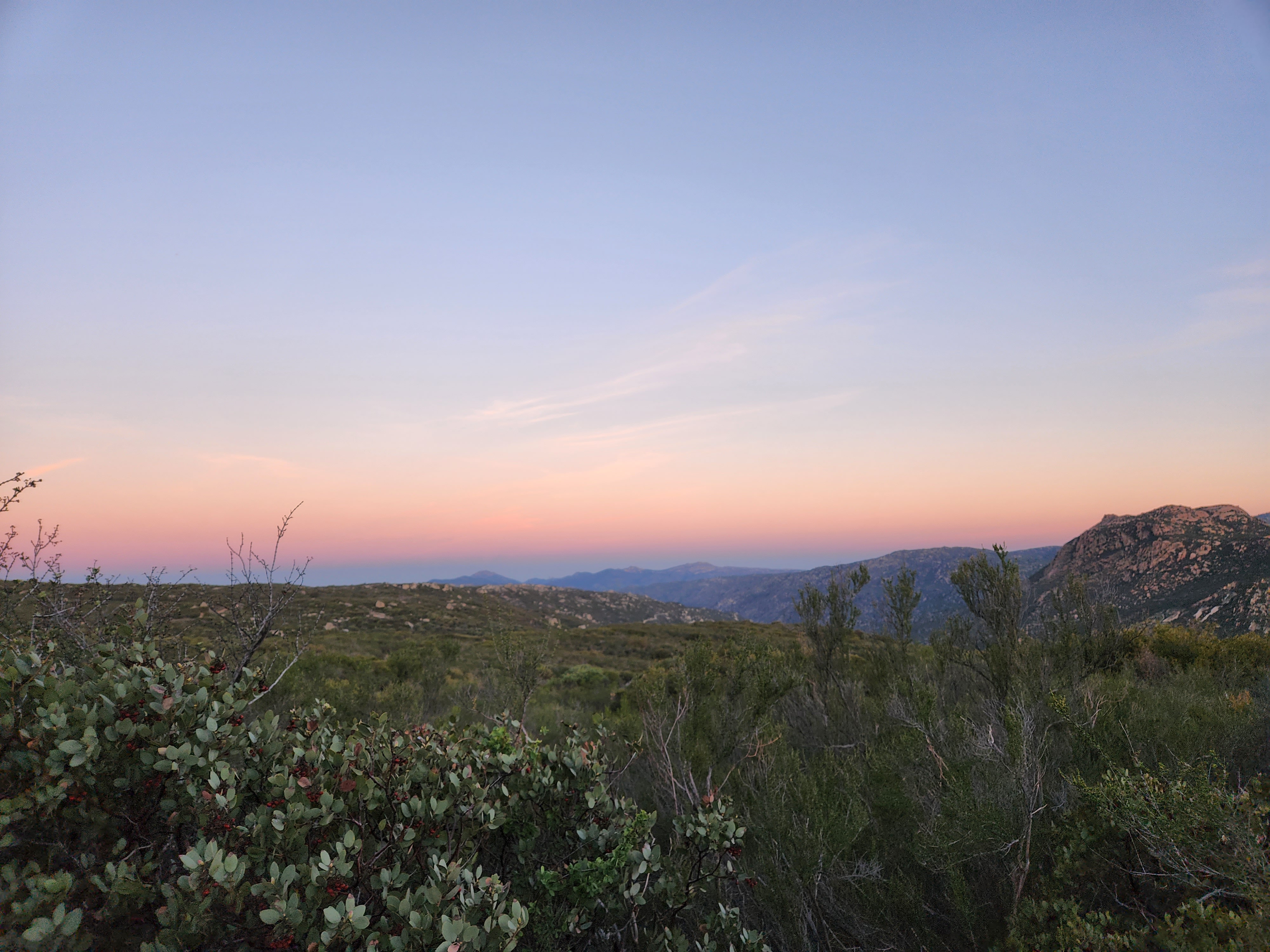 After a few hours in the shade and much stretching, I finally packed up and headed out onto trail around 1700. I was only going 3 more miles to a campsite that promised a wonderful sunset, per Guthook (the map app I use). There was a bit of a climb, but my hip seemed to handle it well and before I knew it I was upon my chosen campsite. Another hiker named Luda was already there. He was cowboy camping, which is something I’ve not had the courage to try yet. I like my DCF coocoon of privacy. It gives me a false sense of safety, I think.