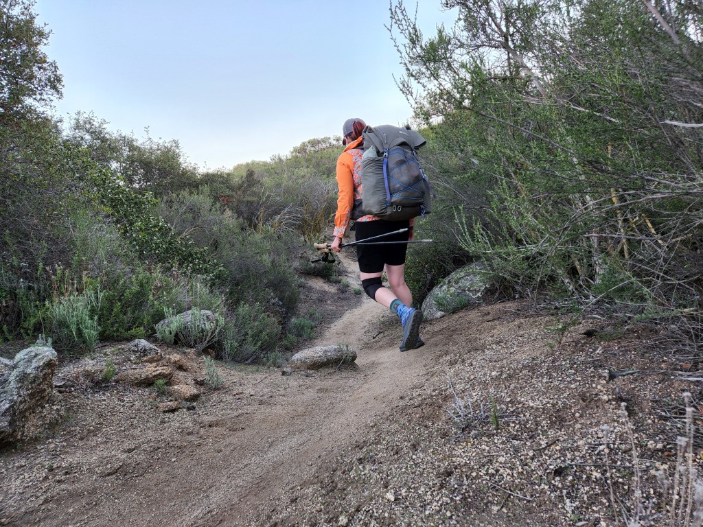 I actually kind of got hot overnight and had to take off my sleeping fleece. I got going around 0600 with a smile on my face, which is still wild to me considering I used to think getting going early was such a struggle. I meandered down through some boulders and saw the lights of cars speeding along a highway in the distance. Once I got down into the valley and near the vegetation it quickly got chilly and I had to put my puffy on. I sped along a dry creek bed with the sun peeking over a mountain range to the east. A fog seemed to hang over the hills as I made my way to Boulder Oaks Campground and some of the cleanest pit toilets I’ve ever seen. I’d spend the night in them!
