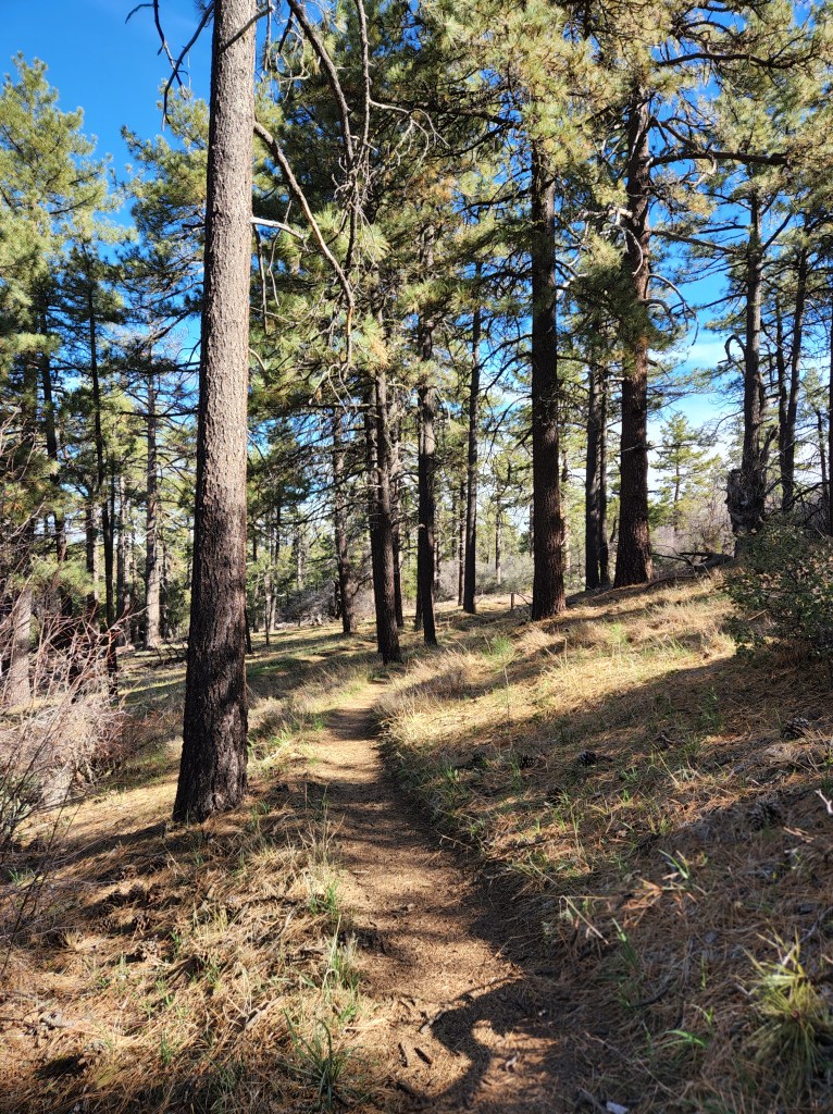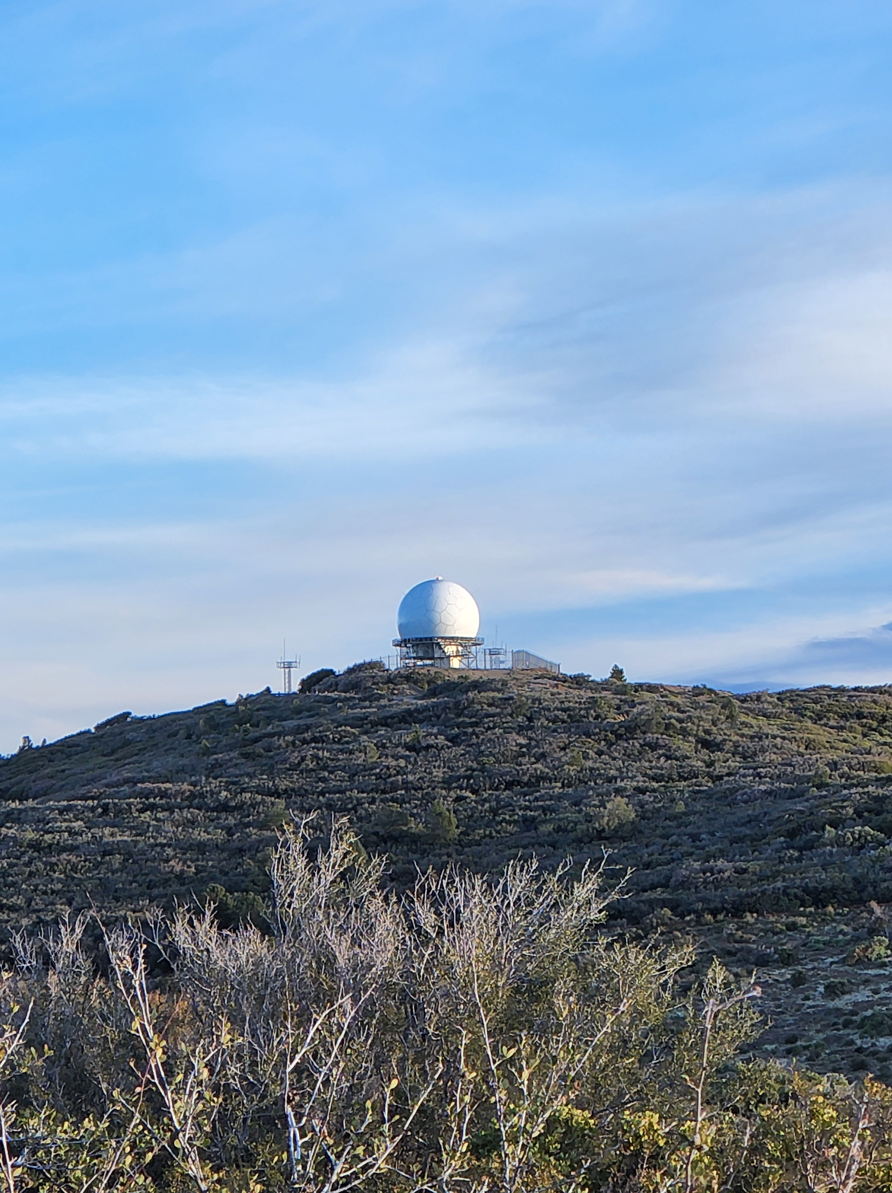 Back on trail, the dreamy quality of the light continued as the sun rose slowly over the mountains gradually waking everything up. I was on a ridgeline overlooking a wide vista and saw the sharp gradation from cool blues to warmer tones. I was still in the pines and it felt a little like walking in woods at home. I saw a huge golf ball thingy that the USAF owns. It became a reference point to how far I’ve gone through out the day.