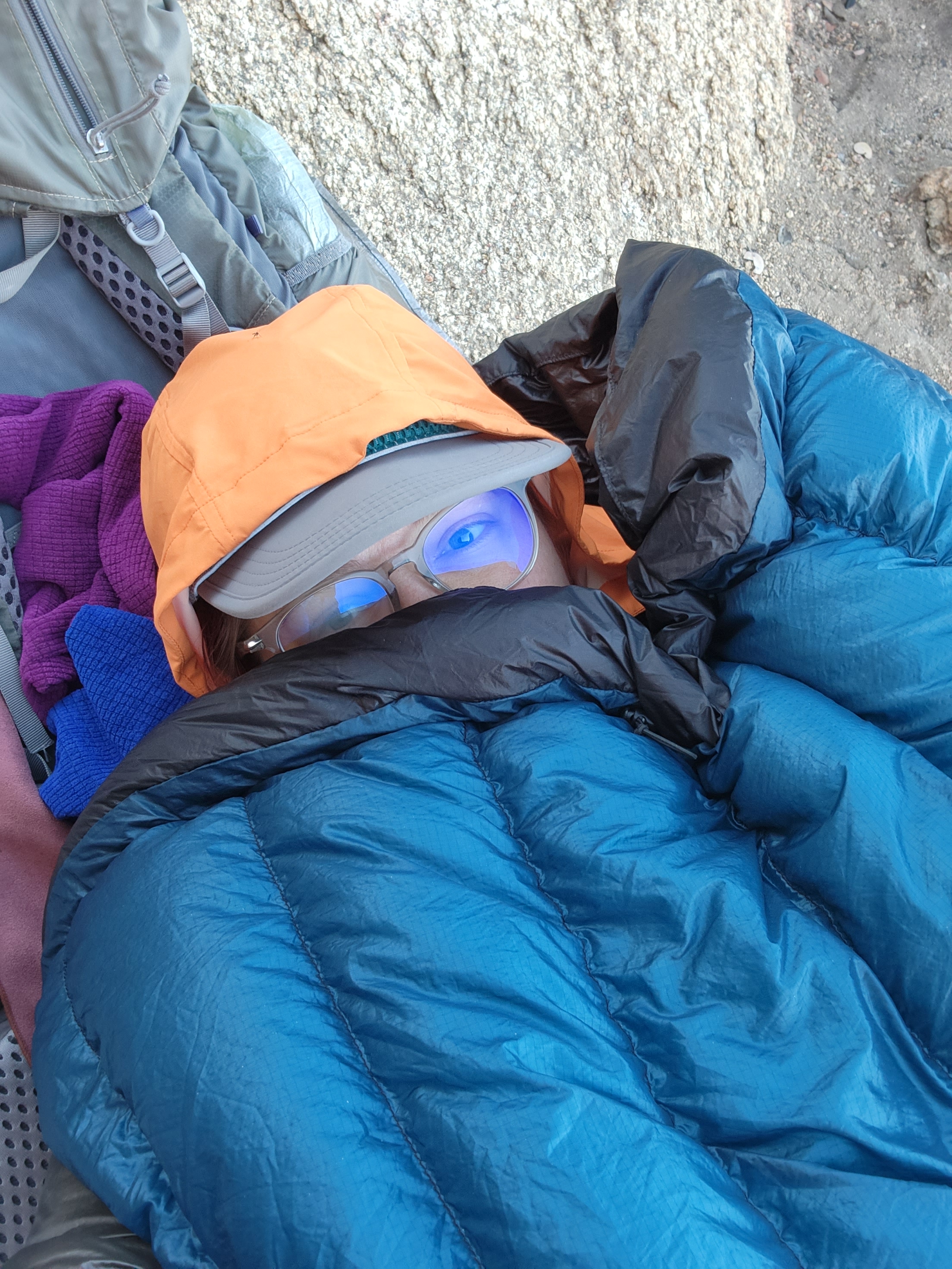 After lunch it was a race to more shade and the stopping point for the evening. The sun beat down on my orange sherbet sun hoodie making everything glow. Light was EVERYWHERE! Bouncing off of rocks. Reflecting off shiny plants. Sparkling in the sand. This was my first indication that maybe I shouldn’t walk through the heat of the day, but I stubbornly trudged on. I made it the campsite at 1430, which was early but I was BEAT (TM). The sun/heat drained away any and all of that peppy energy I started with. I plopped down on the bare rock under some shady manzanitas, chugged half a liter, and promptly fell asleep.
